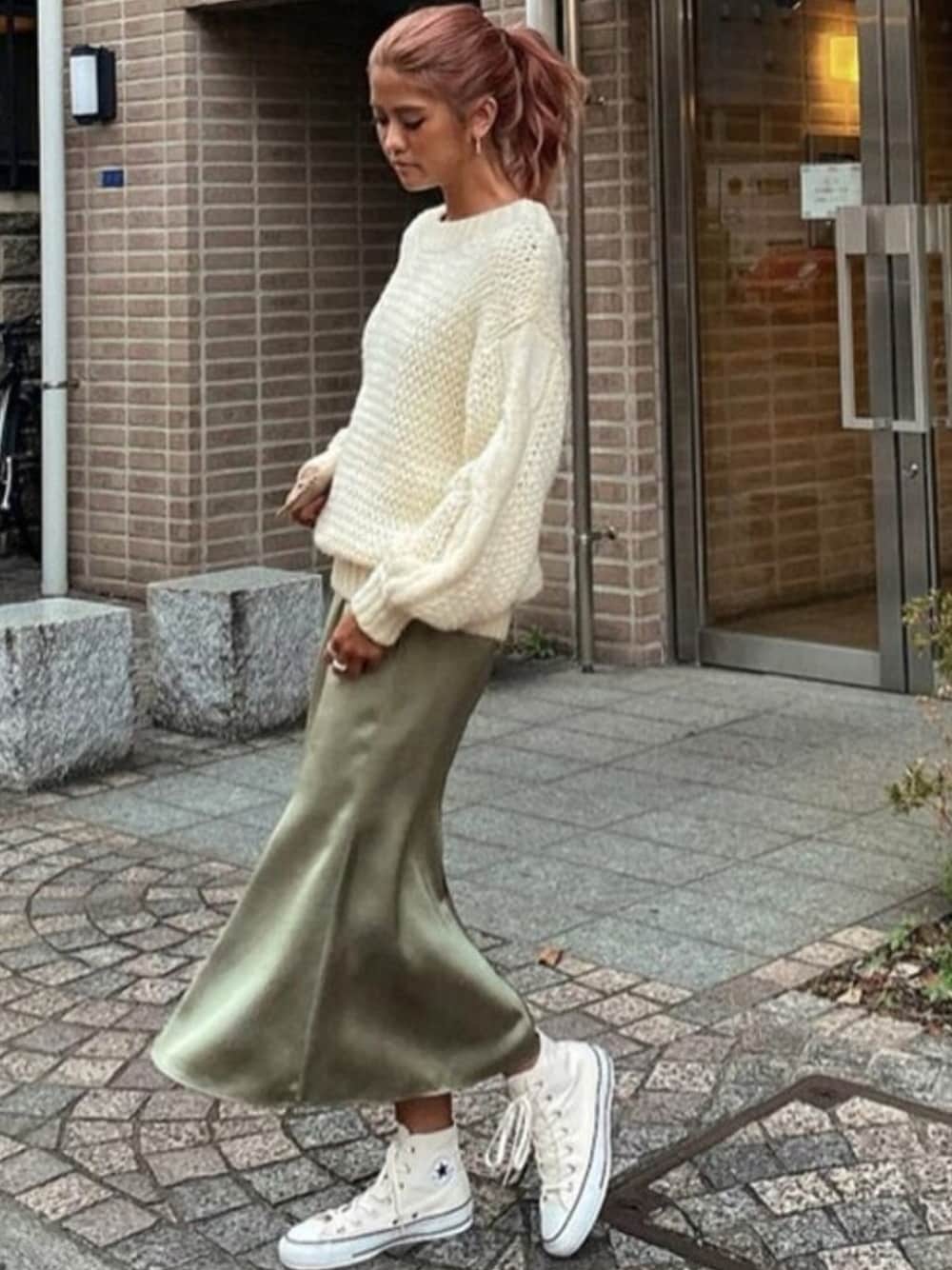 サテンのマーメイドシルエットスカートに オーバーサイズのニットを合わせて♪ コンバースでカジュアルダウン☺︎ STAFF:mana instagram:@mana_resexxy