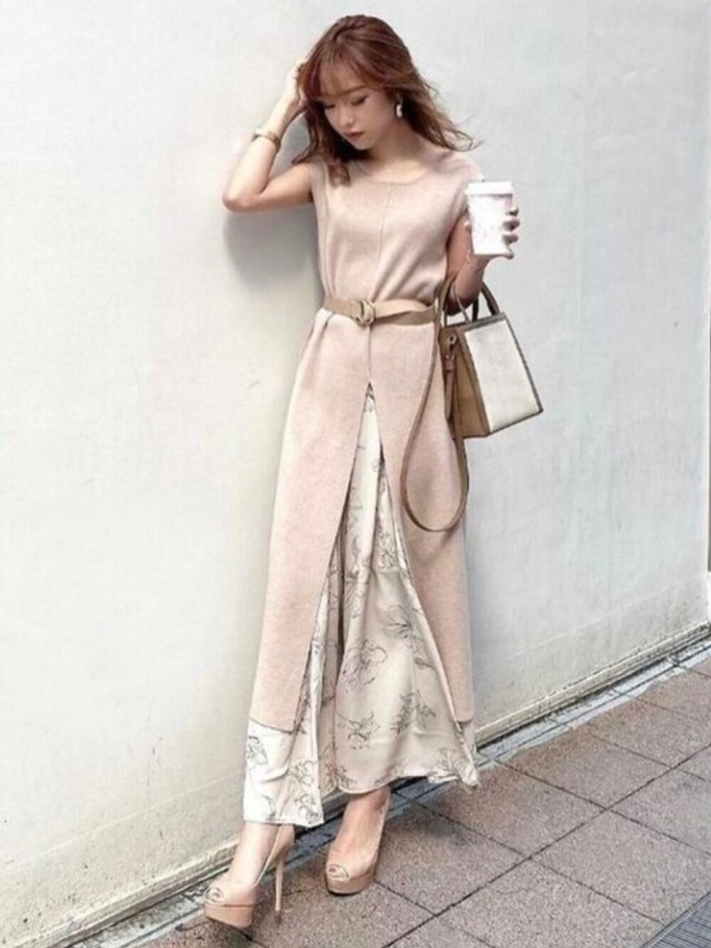 全体的にベージュで統一することで柔らかい印象に❤︎ スリットからチラリと覗くフラワースカートが女性らしくデートにもぴったり! セットのリボンはベルトに変えてもgood! STAFF:erika instagram:@erika_resexxy