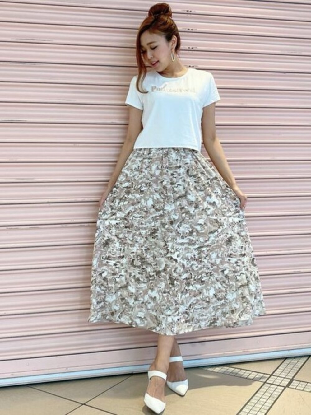 Tシャツはカジュアルになりがちですがフラワースカートと ピンヒールを合わせる事で可愛らしく女性らしいコーデに♡ シンプルすぎず立体感のある刺繍のロゴがポイントのTシャツ♡ ホワイトは透け感気になる方多いですが、生地がしっかりしてるので透けにくいです! フラワーのカラーとロゴのピンクを揃える事で統一感のある春らしい明るいコーデに! アップヘアでも可愛いですがふんわり巻き下ろしでも可愛いですよ! スカートのウエストはゴムになっているので伸縮性もありとても履きやすかったです! STAFF:shiho instagram:@shiho__rs