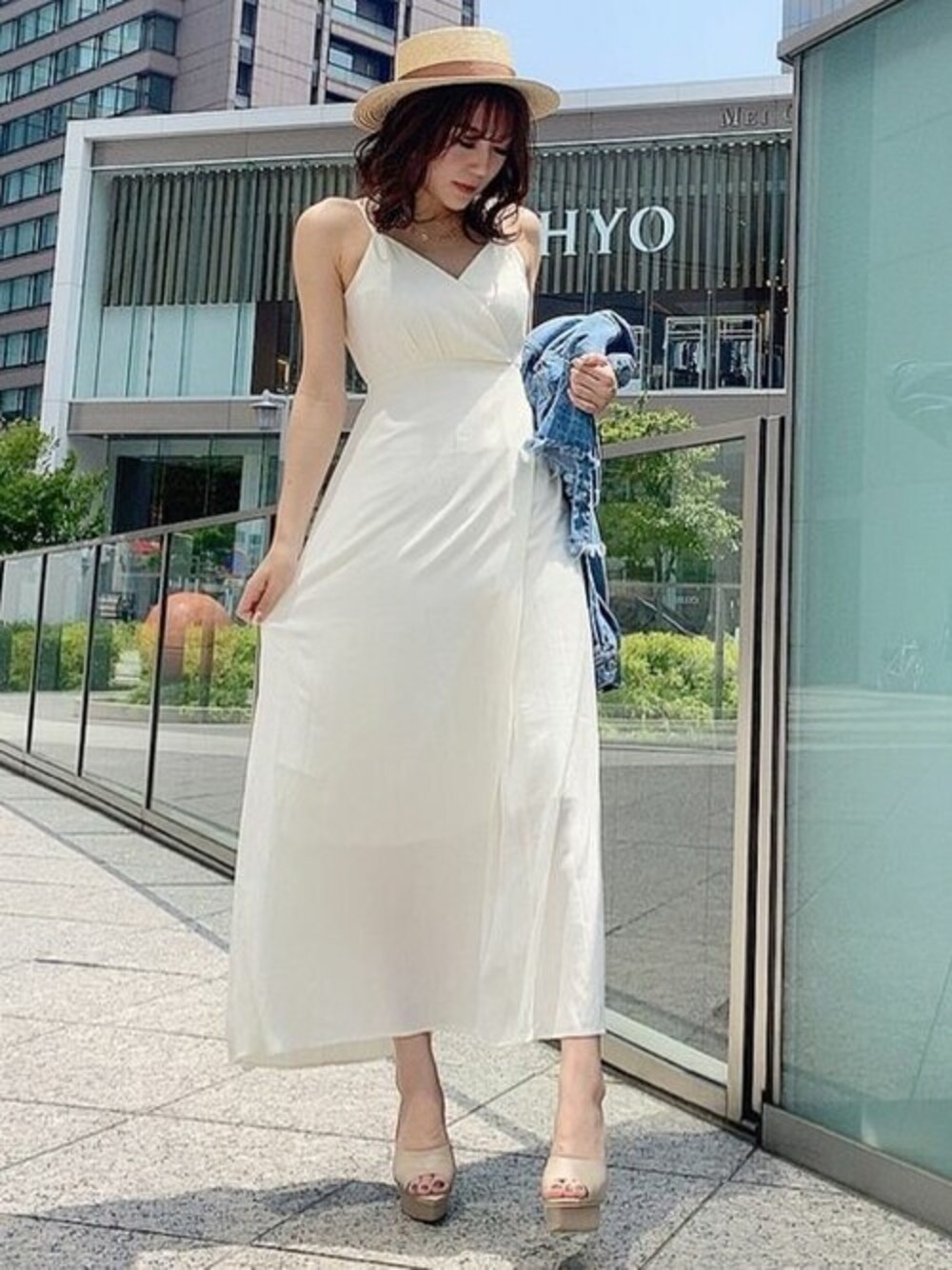 入荷前から狙ってた毎年人気なキャミワンピ♡カシュクールデザインなので、着るだけで女性らしさが溢れます♡ サテンのようなツルツルした素材とは違い、楊柳に似たシワのある素材な為、色っぽすぎない上品なワンピースに。 胸下切り替えになっており、脚長効果+細見えします。またサイドジップの着脱なので元々の綺麗な形が活かされ、 ウエスト部分が1周ゴムでなくても引き締まる為、スッキリとした印象になります。 クロスデザインのキャミソールなので、バックスタイルも抜かりなく♡しかもアジャスター付きなので身長に合わせて調節する事が可能です! 161cmで足首が見える丈感なので、150cm前後の方はマキシ丈になると思います。 ですが、裏地が膝丈になっており裾が透けるので重たい印象にならず、気軽に着て頂けますよ☆ カシュクールフレアワンピースは、かなりシンプルなワンピースなので、ポイントになる華奢すぎないチェーンの2連ネックレスとピアスを合わせました♡ ボーターハットも被り、合わせやすいシンプルさが仇となり寂しくならないように気をつけました! ロングヘアの方はお団子にして、トレンドのビッグシュシュを付けてもお洒落見えしますよ♡ また、アウターでGジャンを持ってきましたが、万能なシアーシャツを羽織っても◎より夏らしくなります。 STAFF:maki instagram:@maki___rs