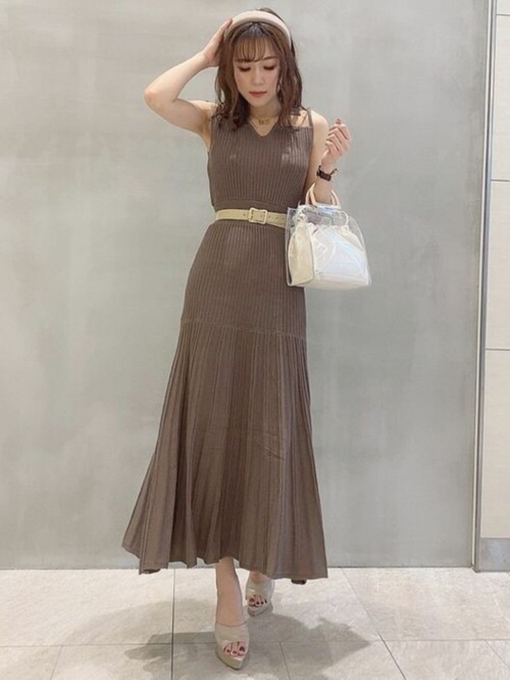 トレンドを取り入れたニットワンピ♡デコルテのシアーと主張し過ぎない襟、裾のデザインに目を奪われました。 女性ウケ抜群なワンピに、ベージュ系の小物で統一感を出し、麻素材のベルトとクリアバックでより季節感を演出しました。 ベージュほど甘くならず、ブラックほどキツくならないブラウンをチョイスし、上品且つ着痩せ効果を狙いました。 テラス席のあるカフェでの女子会に着て行きたいコーデに♡ 元々水泳を習っていたので、個人的にノースリーブだと肩幅が逞しく見えてしまう心配がありました。 ですが襟付き+デコルテシアーなので目線が首元に向き、且つシアー部分で肌が透ける為、良い意味で服と肌が馴染んでくれ、肩幅を気にせず着ることが出来ました♡ 一般的なマーメイドシルエットとは違い、裾の切替が上目の位置にあるので、腰周りはタイト過ぎず裾に向かって大きく広がるマーメイドフレアシルエットでスタイルアップ効果抜群。 また、裾が大きく広がり動きが出やすい為、腕や足首が華奢見えします☆ニット素材なのにカジュアル過ぎず上品に着て頂けます! ブラウジングせず着用し161cmで足首がしっかり見える丈なので、150cm位の方でしたらウエストのゴム部分にベルトを使いブラウジングする事をオススメします。 プラスでヒールを履いて頂くとより綺麗に着て頂けますよ♡ STAFF:maki instagram:@maki___rs