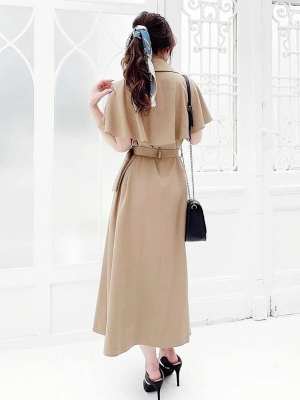 前を開けてジレとしても使えるワンピース♪ ワンピとして着ると一気に上品な大人スタイルに♡ ケープデザインが肩周りを華奢にみせてくれるよ☺︎ ヘアはスカーフアレンジでポイントをつけました♡ STAFF:mika instagram:@mika_resexxy