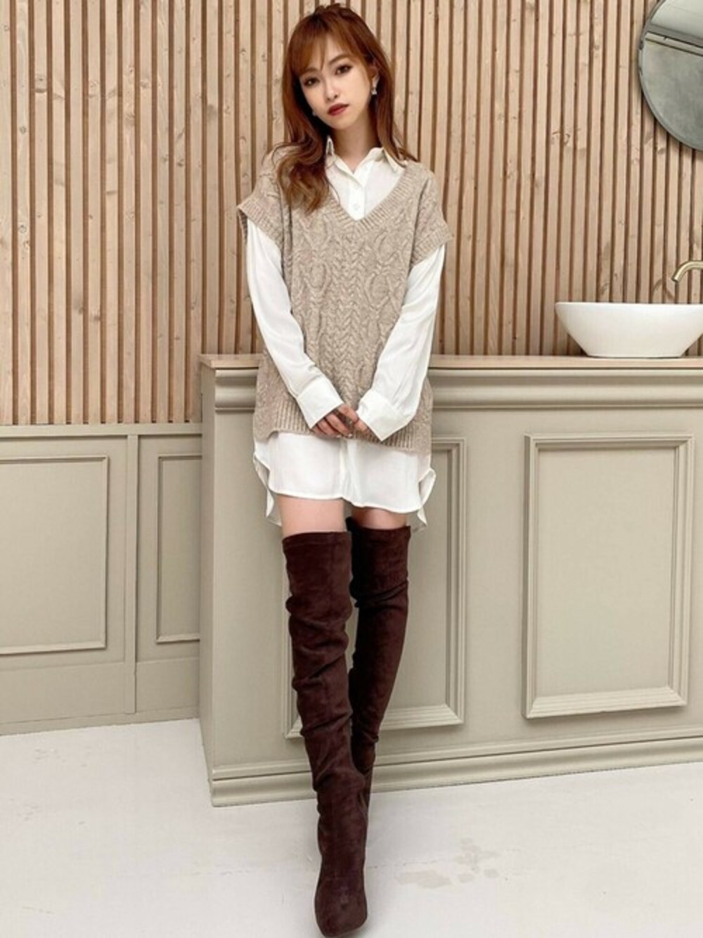 トレンドのニットベストとシャツがドッキングになった1枚♡ ロングブーツを合わせるとスタイルアップ効果◎ STAFF:erika instagram:@erika_resexxy