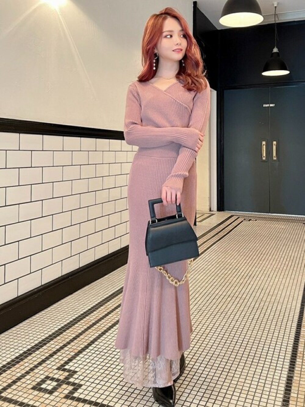 大人気のマーメイドシルエット! 甘くなりがちなピンクはブラックの小物と合わせてちょっと大人に♪ STAFF:miyu instagram:@miyumiyu1112