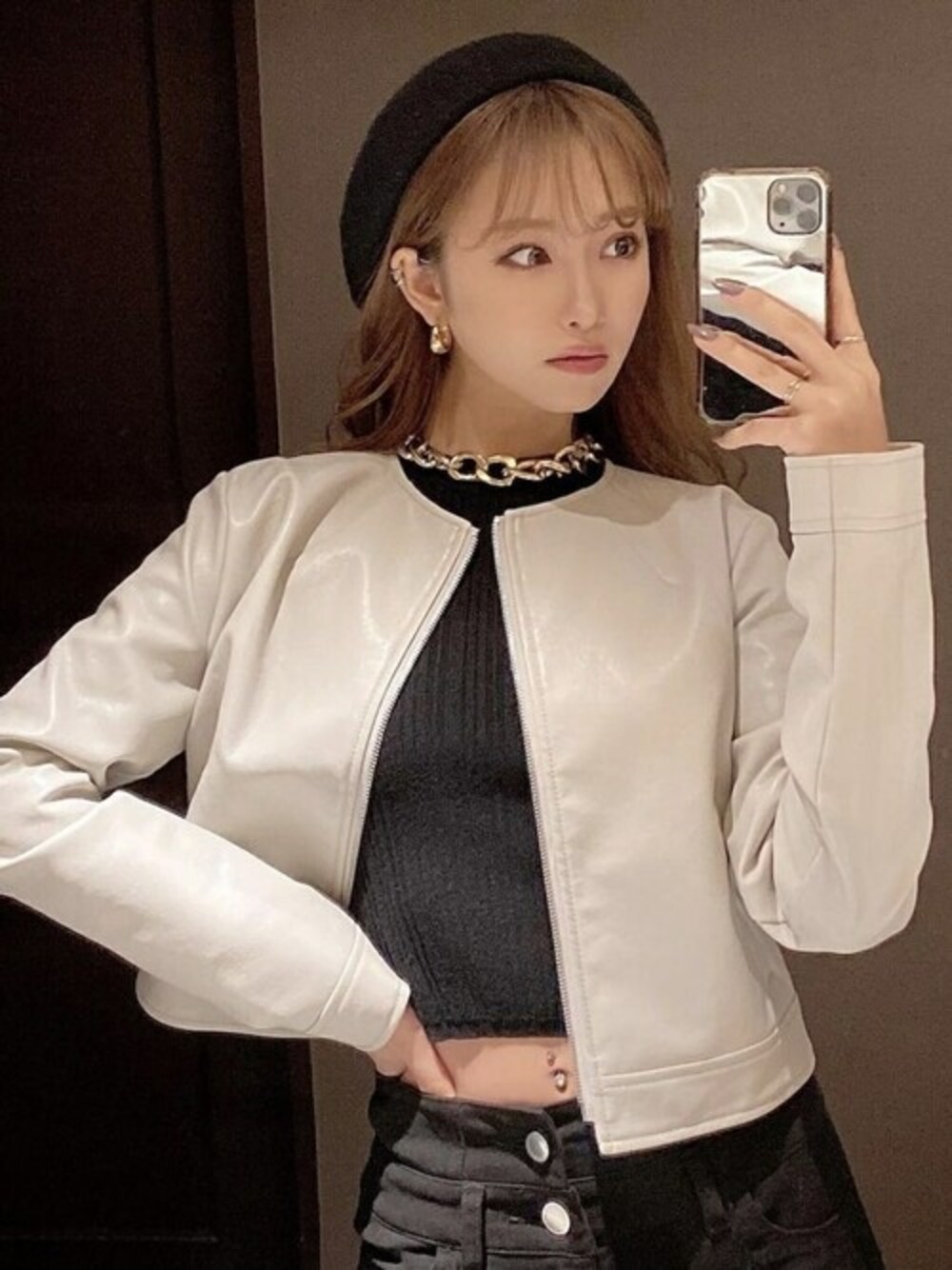RESEXXYのノーカラージャケット「合皮ノーカラージャケット」を使ったコーディネート