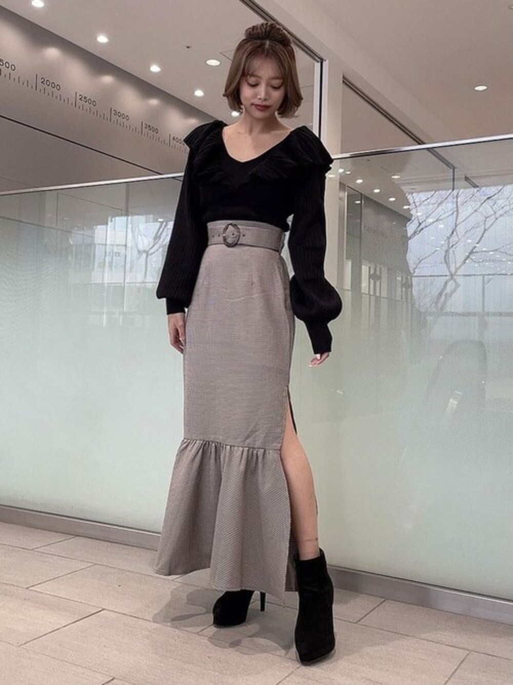 マーメイドシルエット好きな方必見コーデ! ラッフルデザインのトップスはボリュームのある可愛らしいシルエットなのでピタッとするマーメイドスカートと相性ばっちり◎ STAFF:ai instagram:@ai_____rs