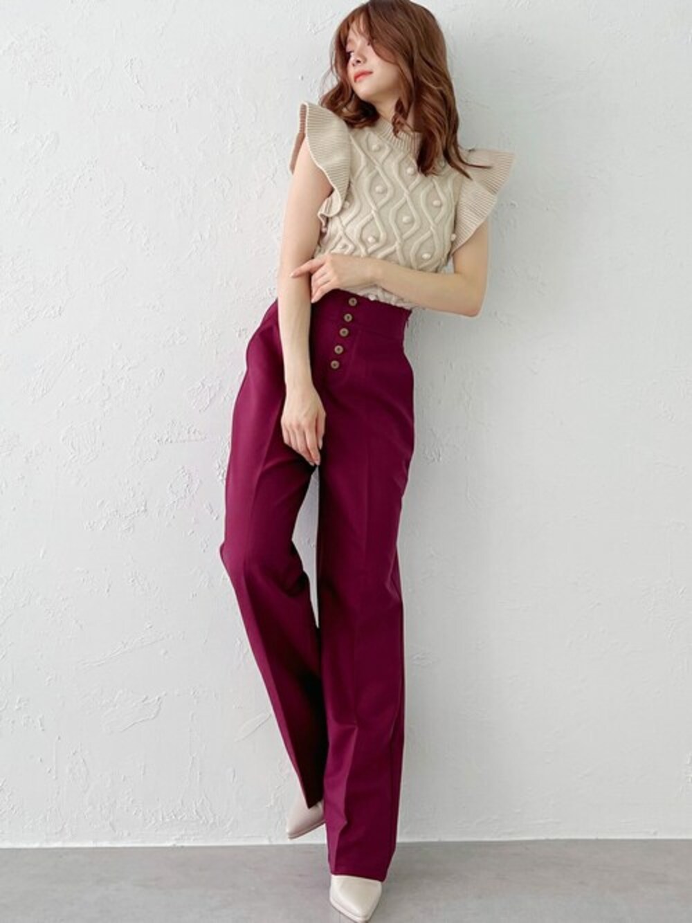 トレンドのカラーパンツがコーデの主役!! トップスとシューズのカラーを揃えるとまとまりが良くなるのでおススメ◎ ハイウエストで脚長効果もバッチリです♪ STAFF:miyu instagram:@miyumiyu1112