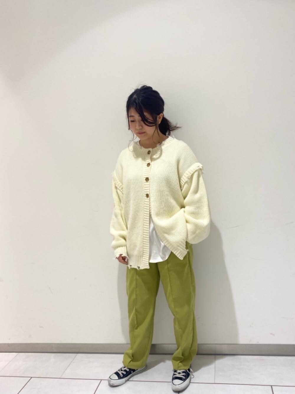 PTのグリーンを際立たせる為にトップスはオフホワイトのNTにしました。シンプルになりすぎないよう、ダメージや袖にデザイン性がある物を選びました。
