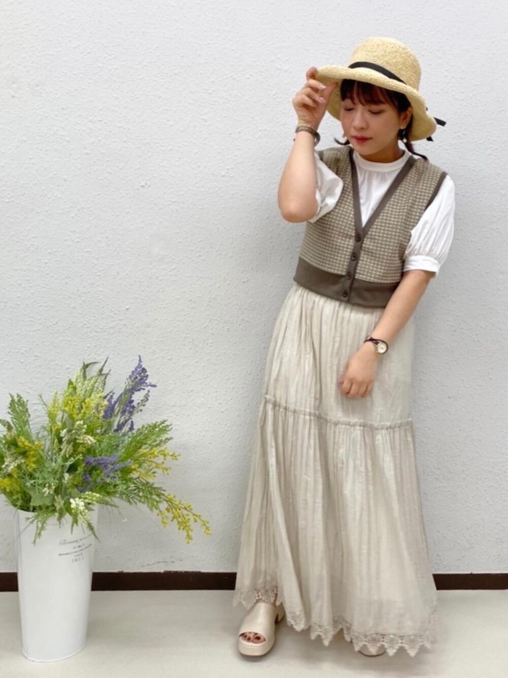 裾にレースデザイン入ったティアードスカートで淡色コーデ🐻 トップス次第で系統様々👀軽い素材とウエストゴムのためゆったり着て頂けます🥰