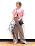 【Champion ショート丈ロゴTシャツ】 シンプルなデザインなので着回し力抜群♡胸元にはシンプルなロゴが。少し短めのショート丈がトレンド感満載です◎Mサイズ着用でゆとりのあるシルエットになりました☺︎ 【チェック開襟半袖シャツ】 トレンドの定番ショート丈デザイン♡ゆとりのあるシルエットに、ショート丈で重い印象にならないトータルバランスもポイント◎ Mサイズ着用で腰までの丈感になりました☺︎ 【「キレカナ」3Dワイドパンツ】 ストレッチが効いたサラッとした生地感なので動きやすさ&穿き心地抜群!デイリー使いはもちろん、オフィスカジュアルやイベント行事にも♪1私はSサイズで着用で程良くゆとりがあり、シルエットがちょうど良かったです☺︎