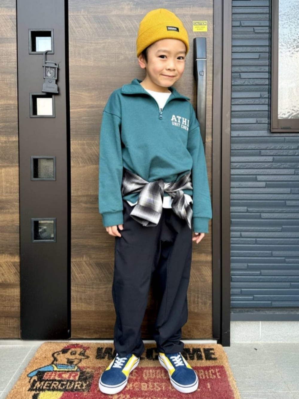 身長:115cm \普段の着用サイズ/ トップス👕:130〜140 ボトムス👖:130 少し大きめ『ゆるダボ』で着ることが多いです! 【ハーフジップスウェットプルオーバー】 大人顔負けハーフジップスウェット!大きめの襟がカッコかわいいです👍🏻柔らかい生地で着心地◎ややゆったりめの作りですが、丈はそこまで長くなく、お尻くらいまででした!裏毛素材なので春先まで長く着用できます🍃 【ロゴデザイン長袖Tシャツ】 ゆったりとしたシルエットの長袖Tシャツ!袖ゴムでお子様が腕まくりしても落ちてこないです!1枚でも、羽織りと合わせても、スウェットやニットのレイヤードとしても…。1枚あると便利なアイテムです😌いつものサイズ130cmをレイヤードとして着用しています! 【オンブレチェックシャツ】 程よくゆったりとしたシルエットのチェックシャツ!!軽くてサラッとした生地使用なので着心地◎羽織りとして…肩巻きや腰巻きに…スウェットやニットのレイヤードに…など1枚あると便利なアイテムです✨ 【ストレッチテーパードパンツ】 軽くて、ストレッチ抜群なので動きやすさ◎ウエストゴムなのでお子様も脱ぎ穿きしやすいです👌🏻腰から太ももあたりはゆったりしつつも、膝から下がスッキリ!130cm着用で丈はやや長めでした! 《着用サイズ》 スウェット:130 ロンT:130 シャツ:130 ボトム:130 ニット帽:フリー