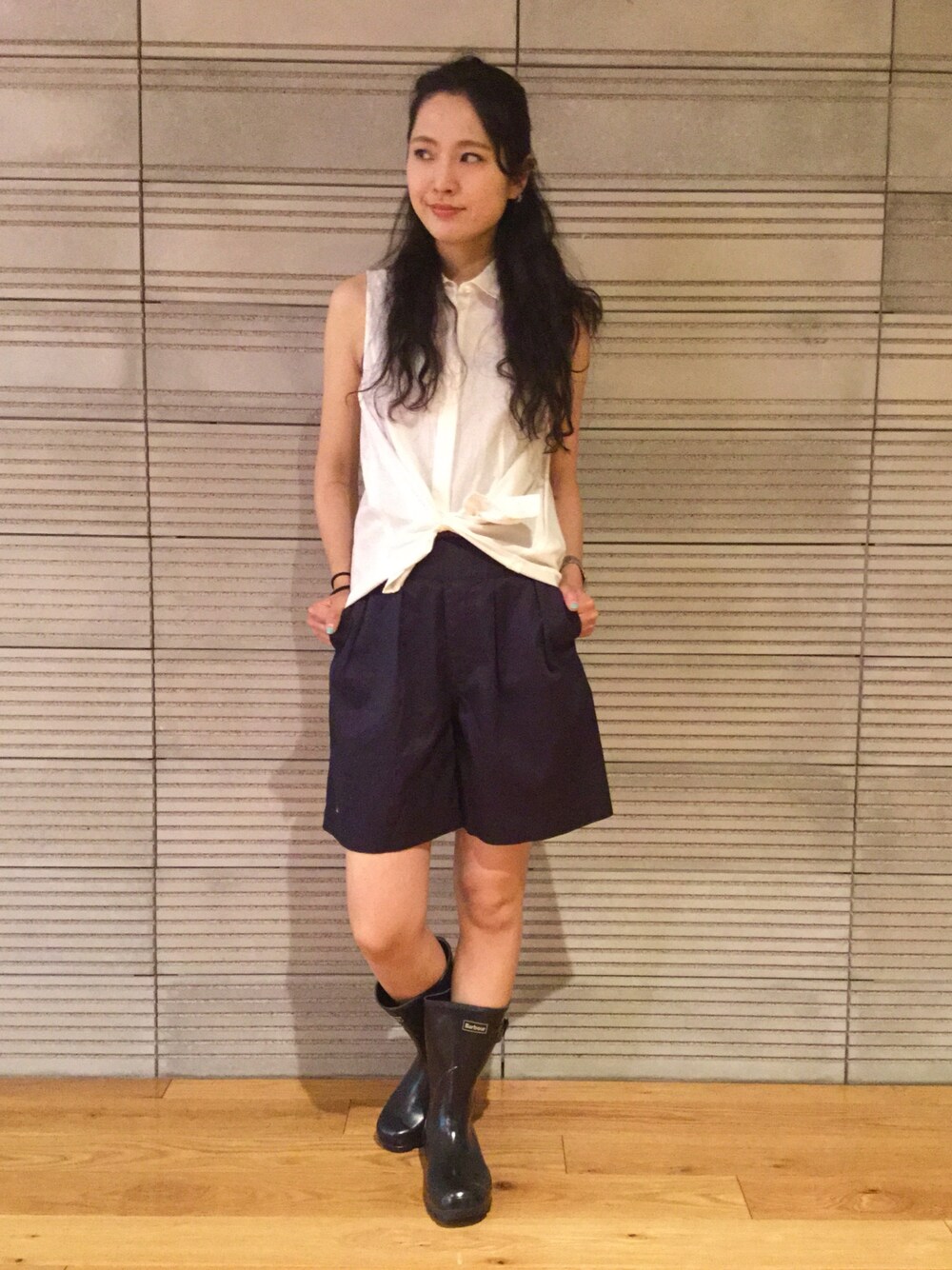 雨の日スタイル第二弾! バブアーのブーツはレディライクなコーディネートに合わせても、一味違う雰囲気が楽しめます。