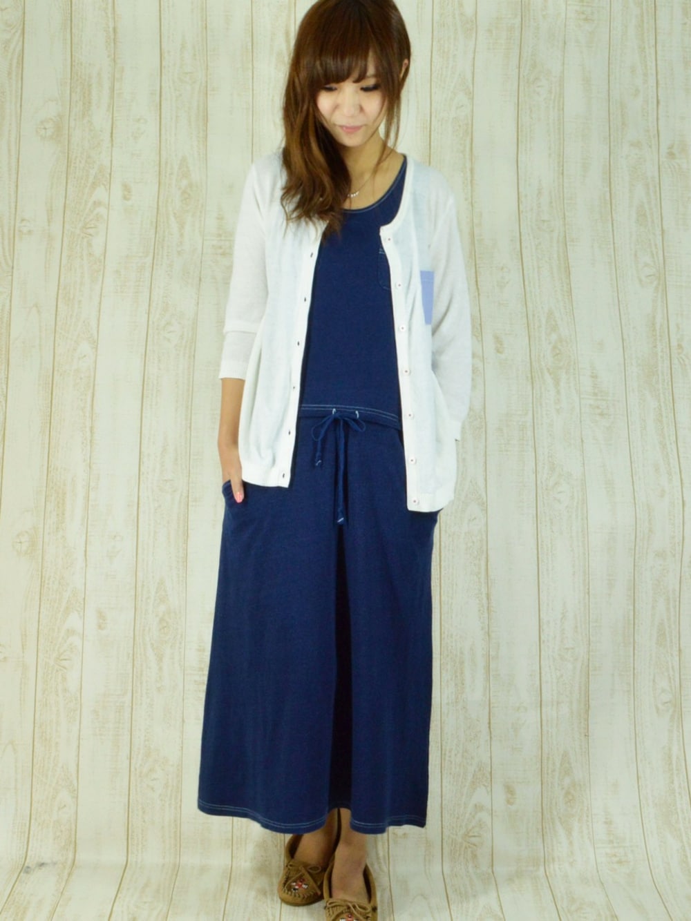 インディゴカラーの裏毛マキシワンピースに爽やかなホワイトカラーのカーディガンを♪ ラクチンなのでアクティブな春のお出かけコーデ!