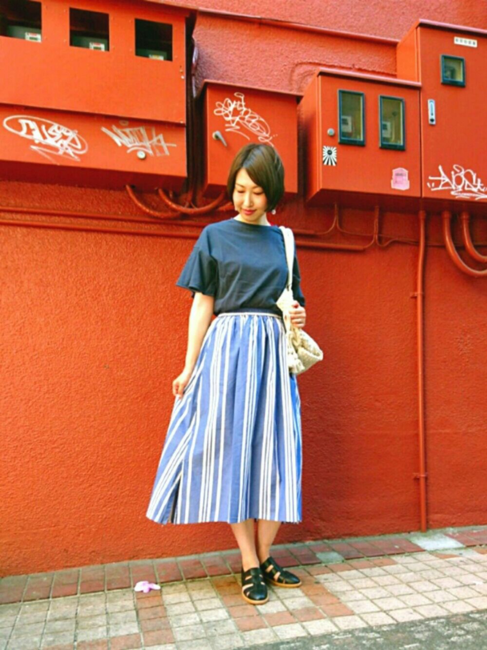 ストライプのスカートがポイントのコーデです‼ トップスのフレアー袖も際立つように、インスタイルで着用しました。