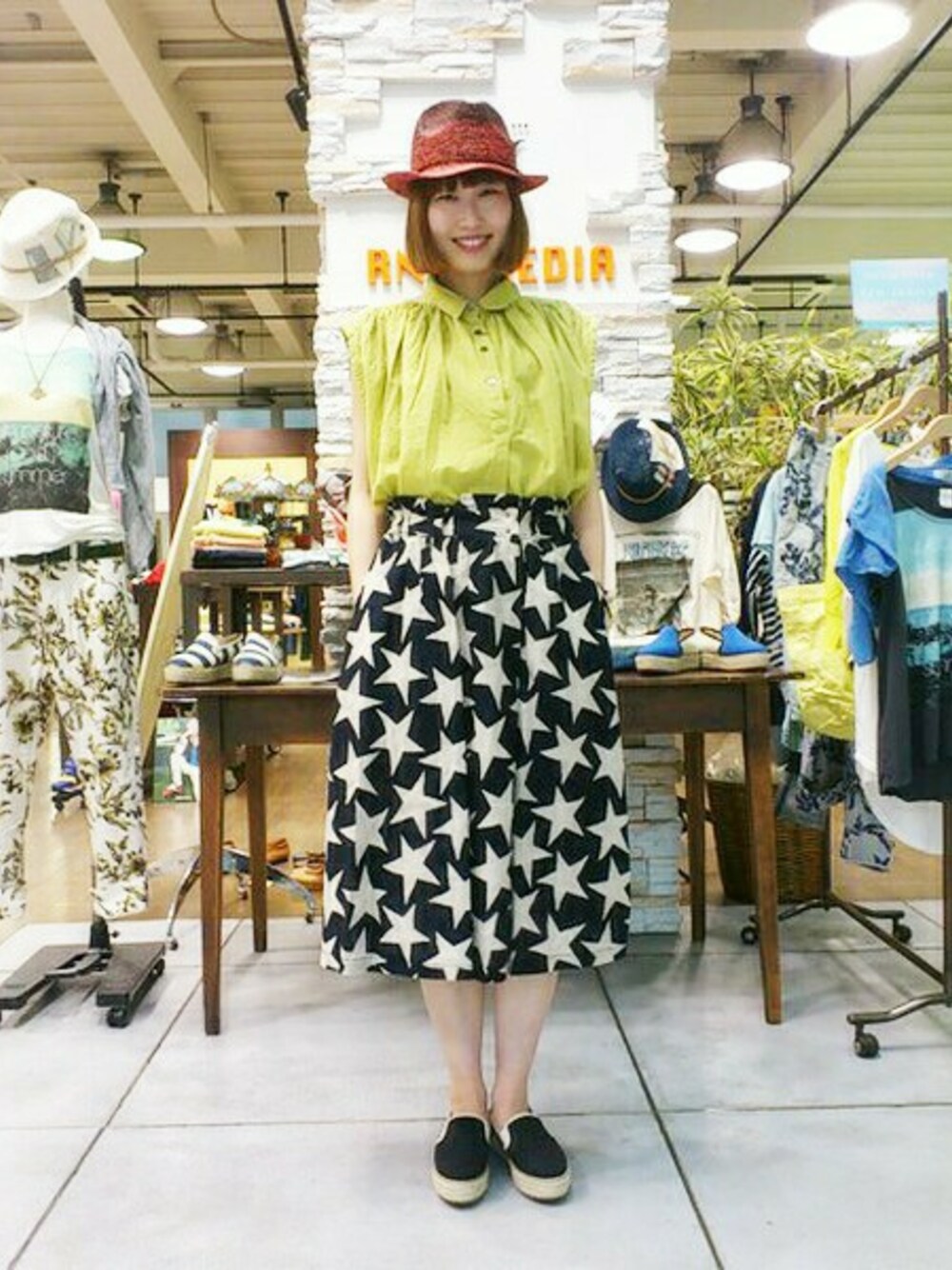 大きな星柄がポイントのスカート♪シャツをインすると、ちょっぴり足が長く見えるかも!?