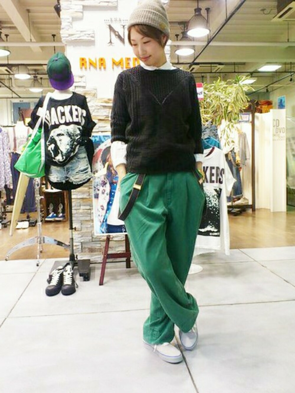 一見、ボーイッシュですが、丸襟のシャツや、ケーブルニットをあわせて、可愛らしさもプラスしました。