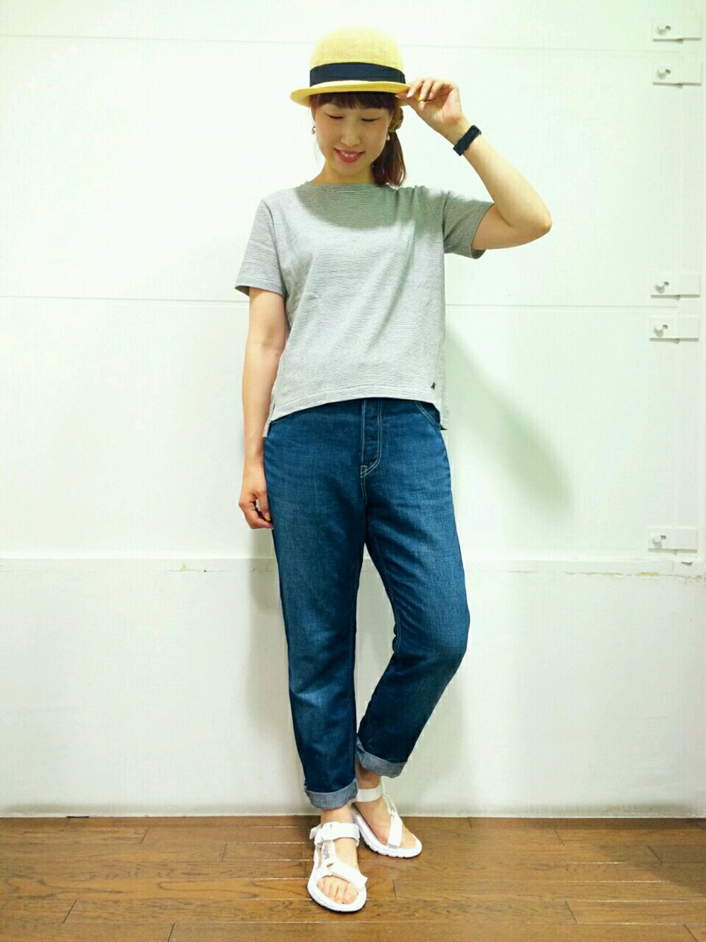 写真だと分かりにくいのですが、こちらのTシャツ、細~いボーダーに小さな刺繍のワンポイント‼詰まり気味な首もとと、短めな丈などこだわりが沢山なのです☆