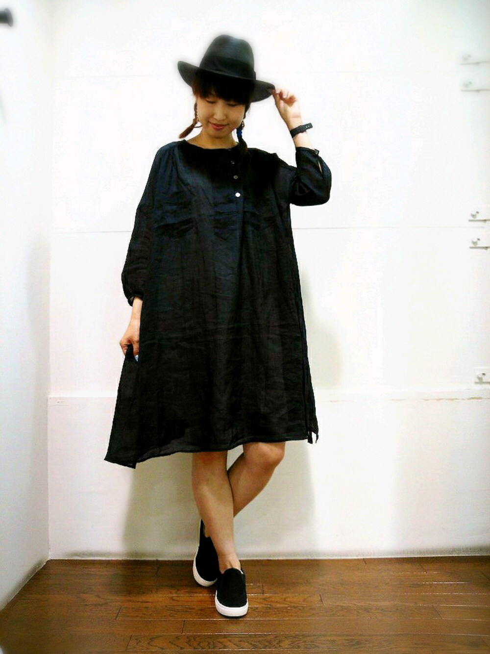 ストンと着られるワンピ。 リネンのワンピは、着ていくほどに馴染み、自然なしわ感や落ち感が出てきます‼ ハットを合わせ、アクセントにしました。