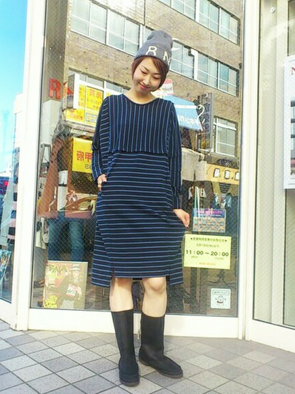 ワンピースは柔らかいカットソー素材で着心地抜群!! ストンとしたシルエットのブーツも、フラットソールで楽チンです♪