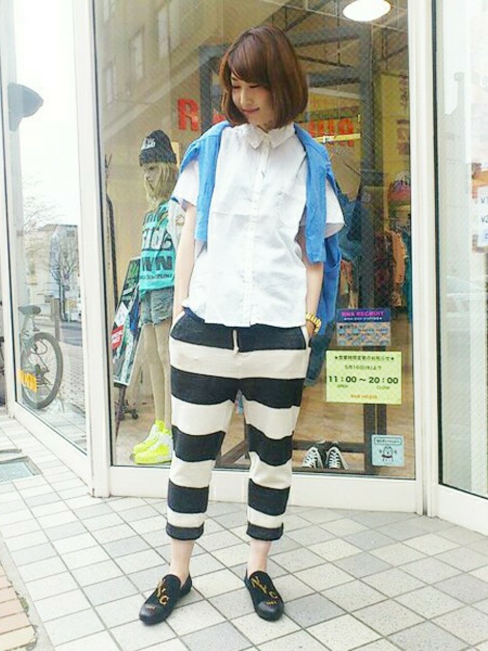 真っ白な半袖シャツに、太ボーダー柄が新鮮な半端丈パンツをあわせ、爽やかさを表現してみました♪