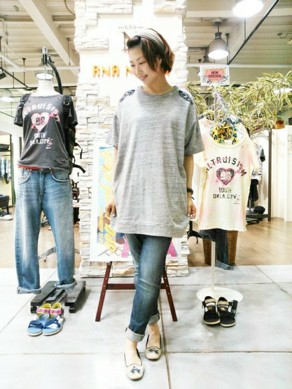 肩のペイズリーの刺繍がワンポイントのトップスをいかし、シンプルなデニムでまとめました。 付け方で表情が変わる、ターバンもオススメです♪