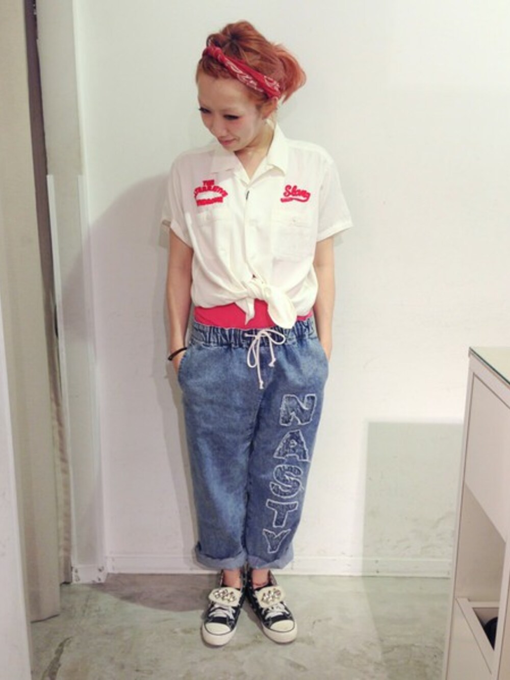 ゆるい雰囲気のイージーパンツにボーリングシャツを合わせました。前で結んでショート丈にしてるのもポイントです