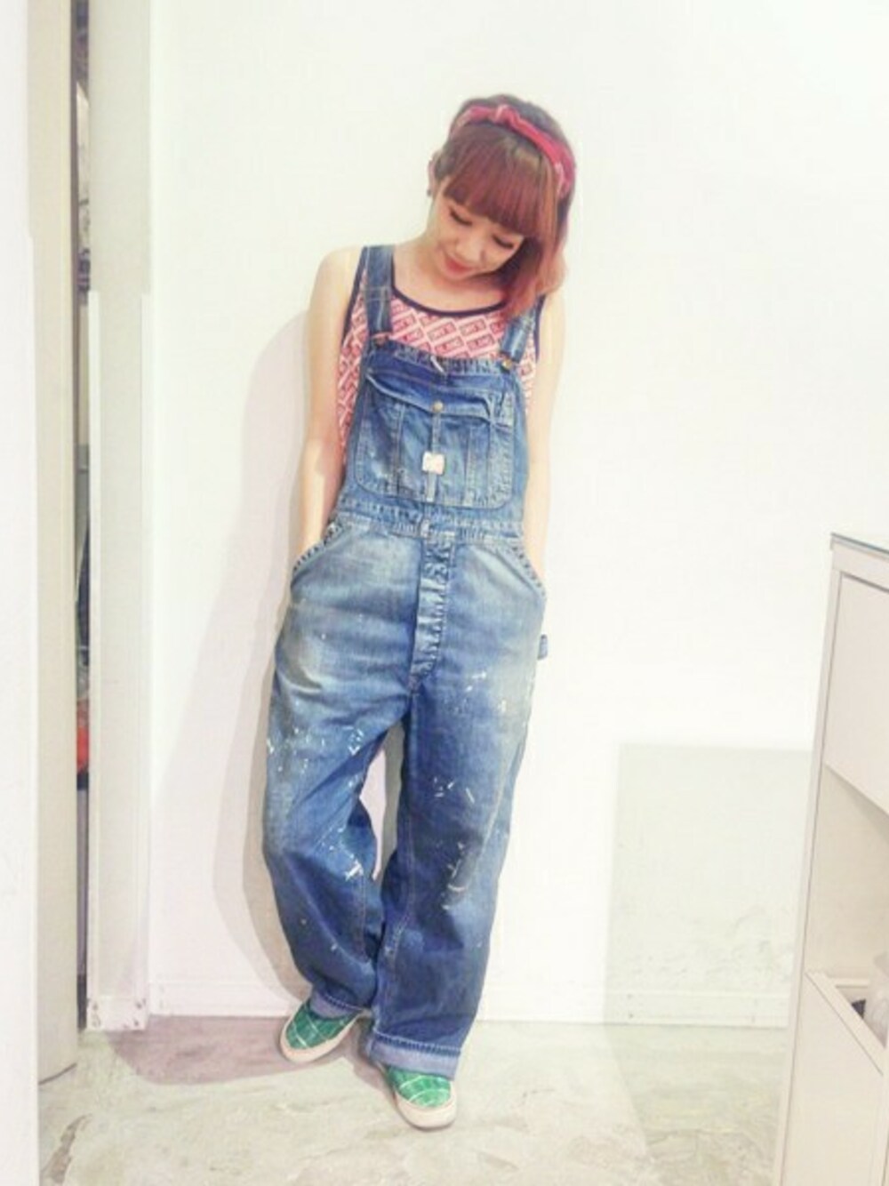 RNA定番のオーバーオールに総柄タンクを合わせた元気なスタイリングです。 素材感が大人っぽいタンクを合わせてカジュアルになりすぎないようにしました