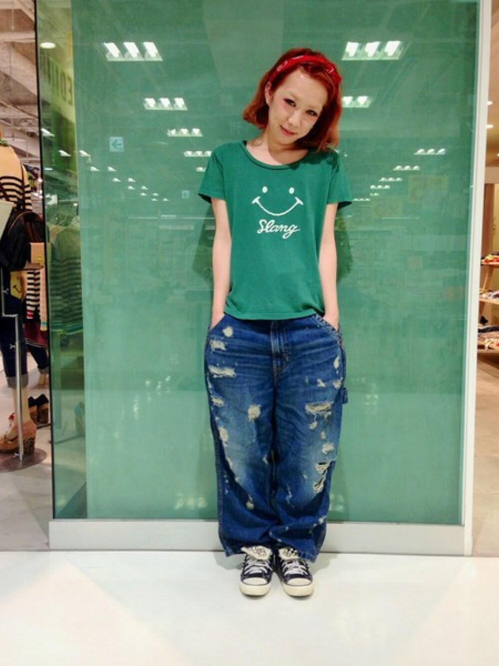 シンプルなベーシックTとイージーパンツの、王道カジュアルなRNAらしいコーディネート。バンダナを巻いてボーイッシュになりすぎないように▽