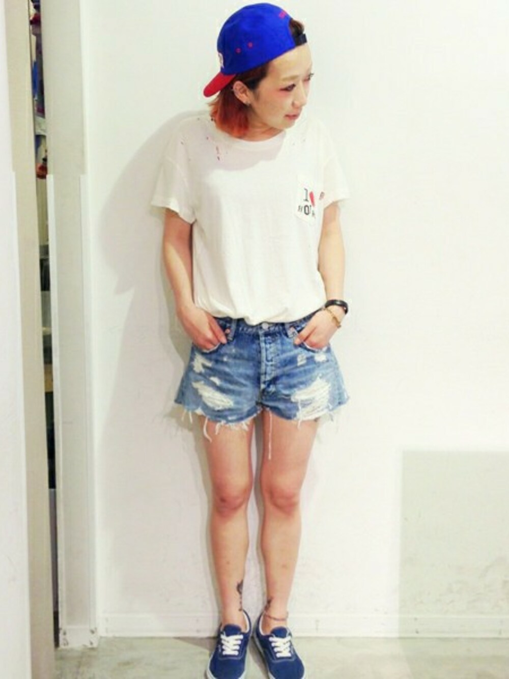 WHITEとBLUEで夏っぽくまとめました。BigTをショーパンにinして少し野暮ったくコーディネートしました。