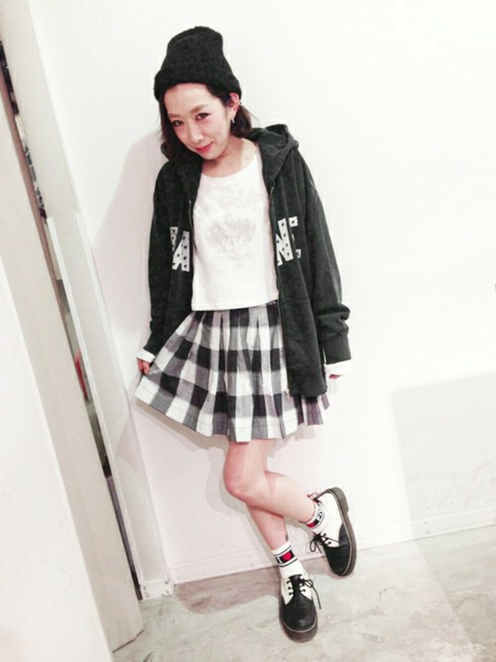 ギャザーがたっぷりのチェックスカートに 大きめサイズのパーカーを合わせて ストリートっぽくコーディネートしました