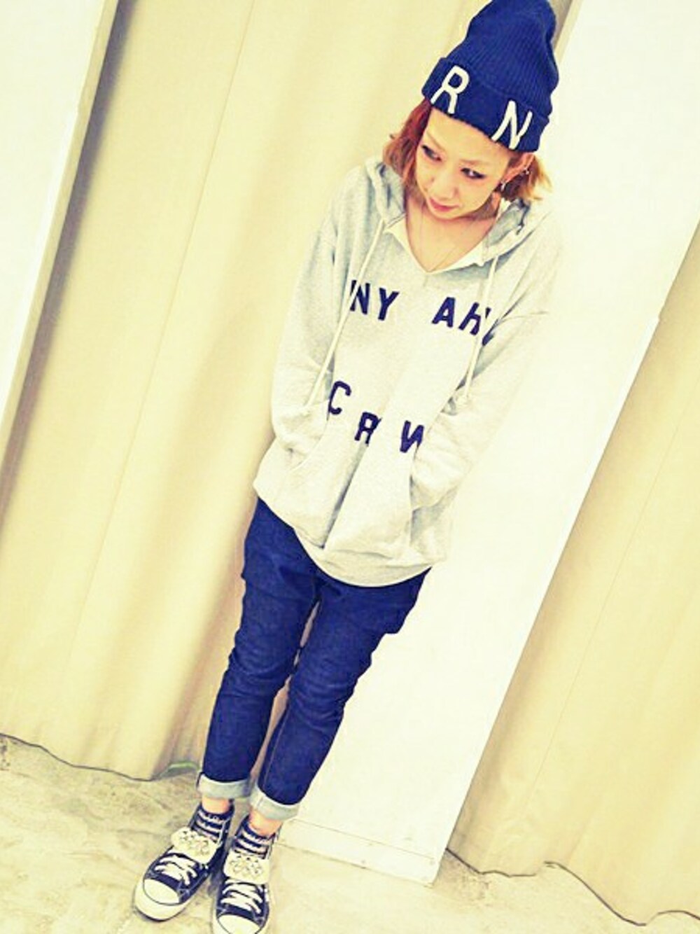 大きめサイズが可愛いヴィンテージリメイクトレーナーに、他のアイテムはコンパクトにしてバランスをとりました