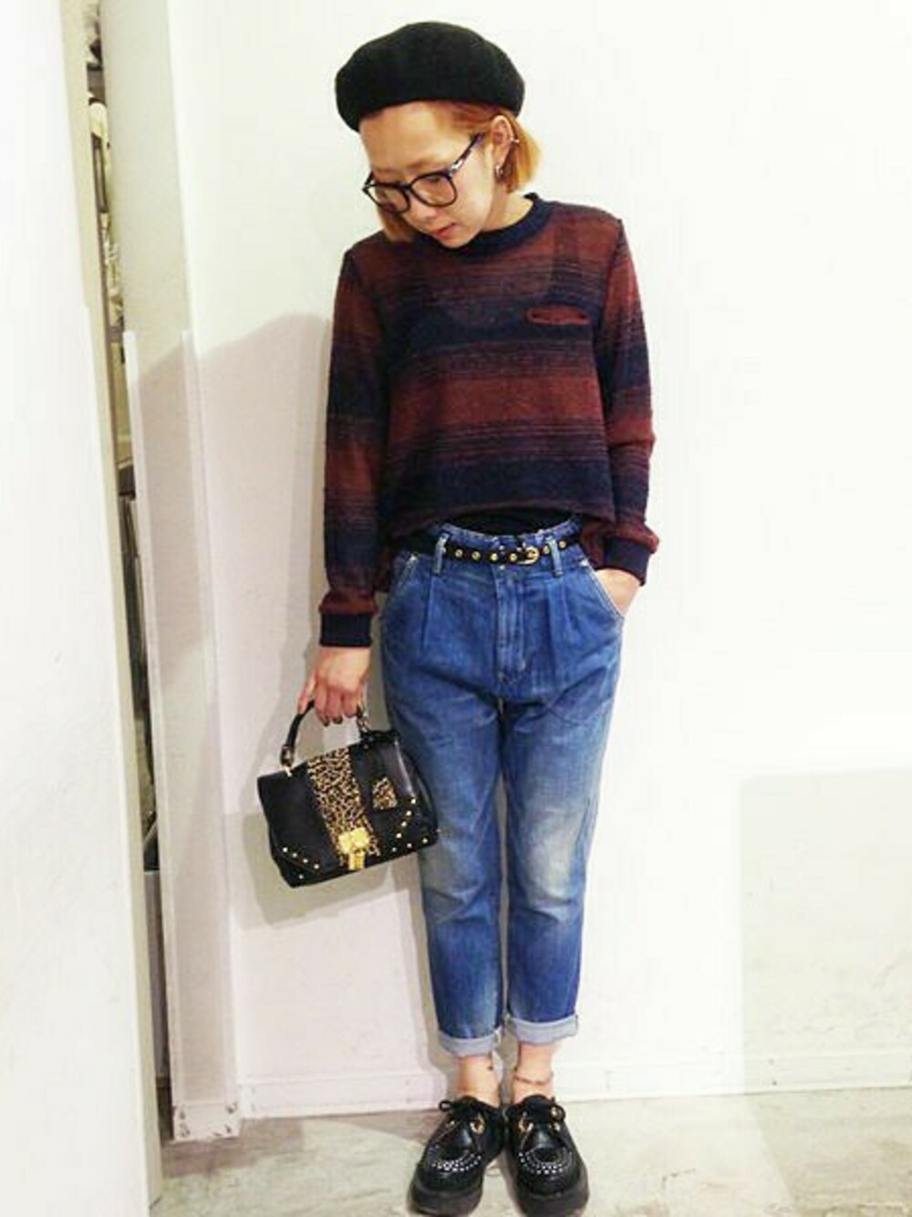 ショート丈のニットとハイウエストボトムでバランスをとりました。大人っぽくなりすぎないようにラバーソールブーツを合わせました。