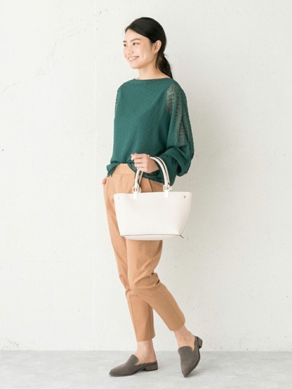 「MIRA プチきれいめファスナートート」「KARINA コンフォートミニマルシューズ」を使ったコーディネート。 シンプルコーデにぴったりなきれいめトートはONにもOFFにも。