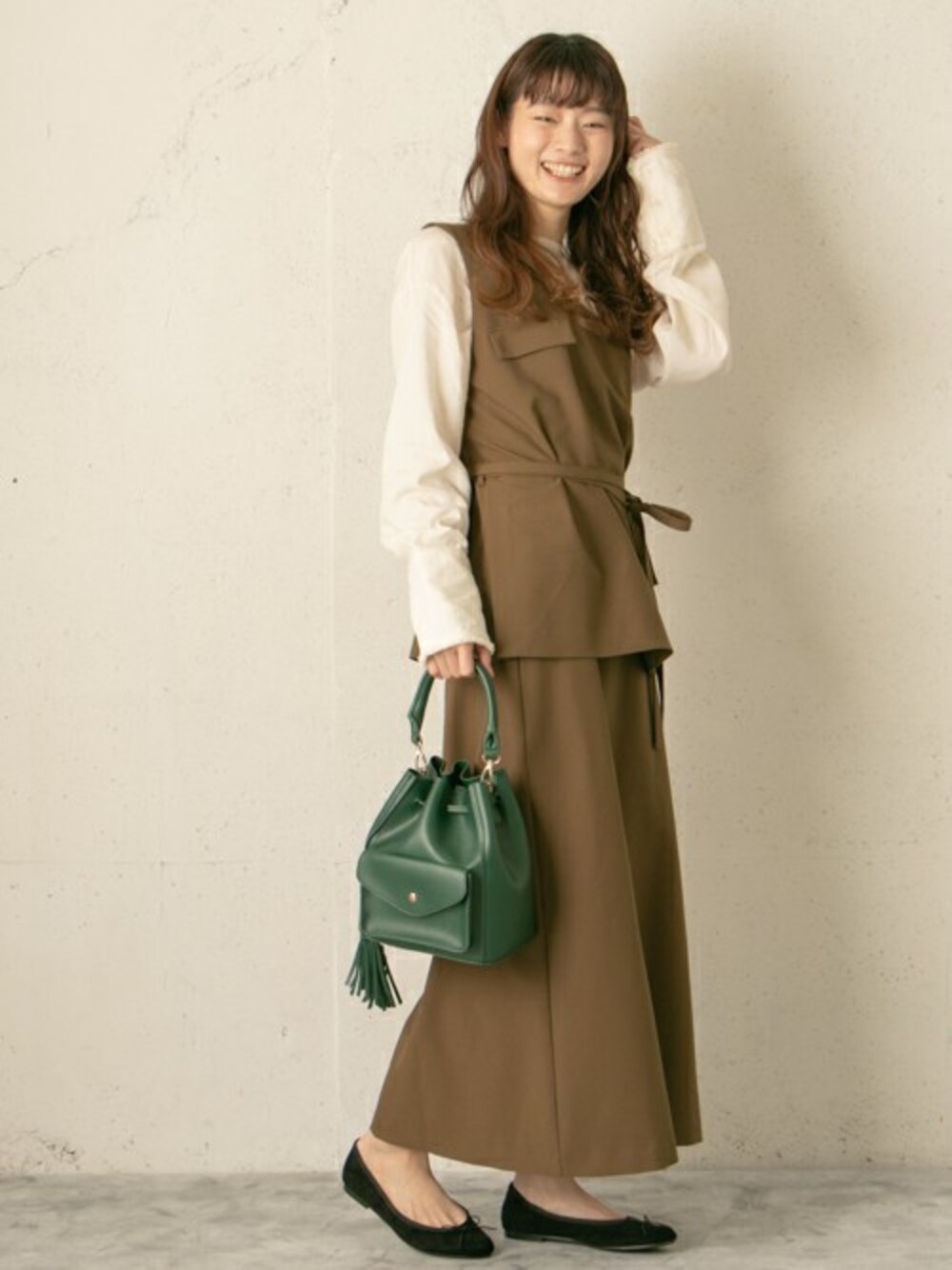 こっくりカラーでまとめたレトロコーデ。 足馴染みのいいバレエシューズは タイツやソックスと合わせても◎