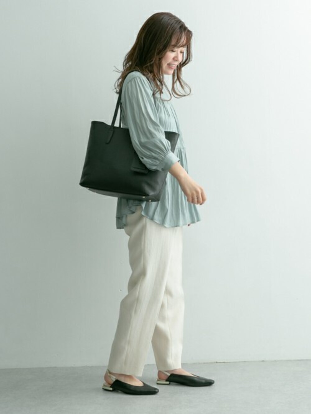 淡いカラーのコーディネイトも、バッグと足元の色味を合わせるとよりキレイめに、全体的に締まって見えます!