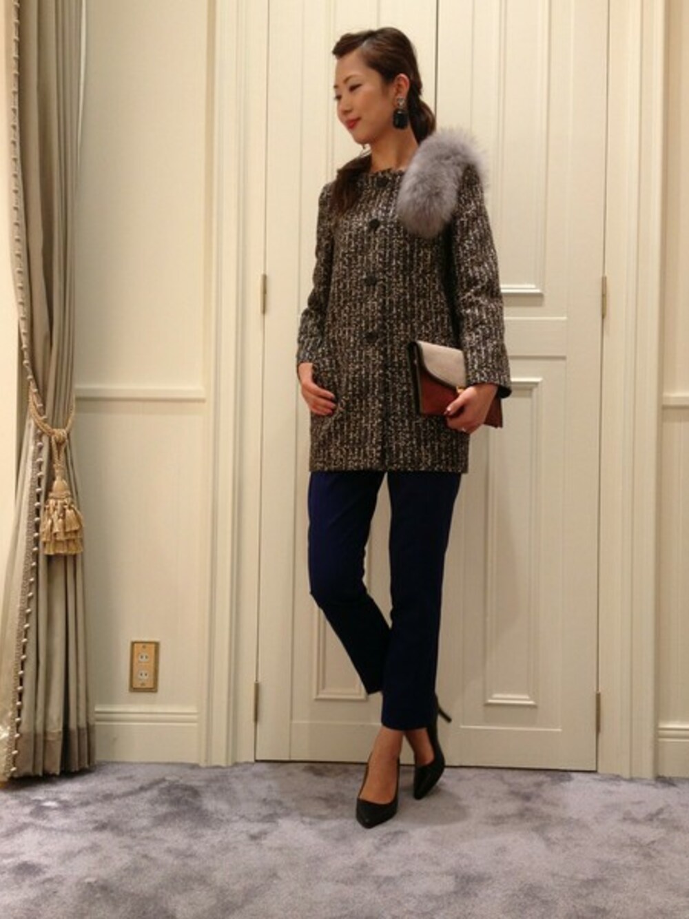 ノーカラーのコートにはファーを巻くとオシャレ度UPします☆