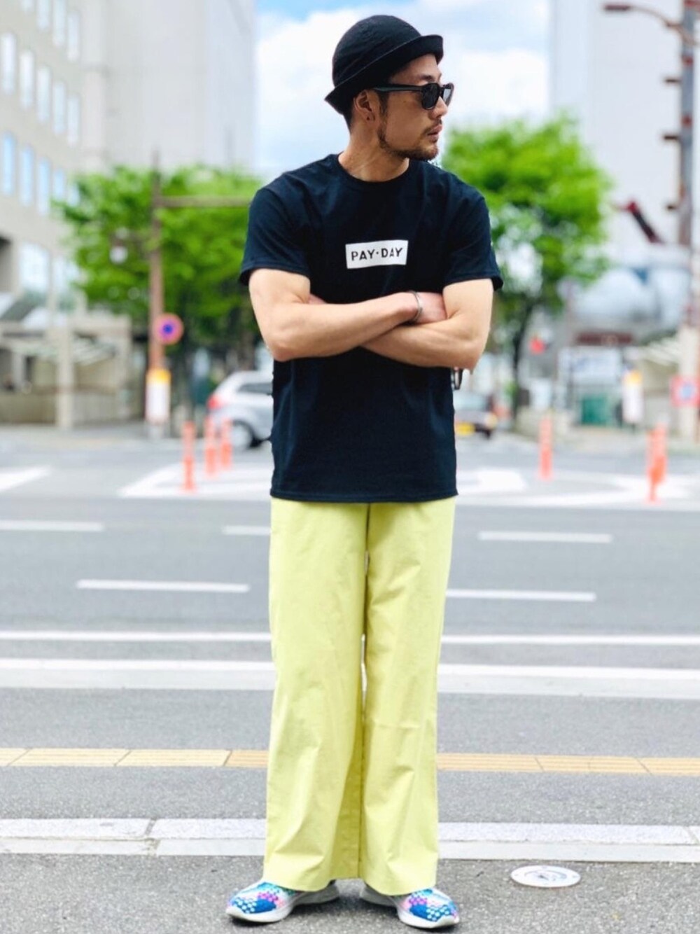 PAY-DAYのボックスロゴが映えるシンプルなスタイル。 上を黒、下をカラフルにして休日のお出掛けコーデ◎