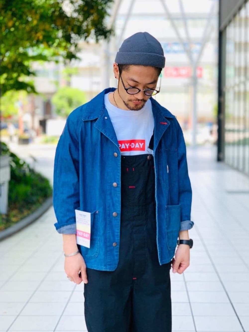 オールPAY-DAYのアメカジコーディネート。ホワイトボディーにボックスロゴが冴えるTシャツはこの夏のお供に! オーバーオールはF by ROSSOのレディースアイテムですがメンズにもおすすめしたい一品です◎
