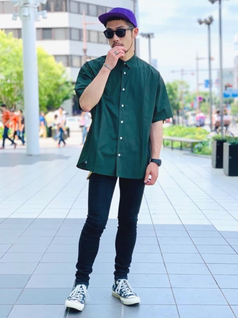 暑さも増してきた今日この頃。 カーキグリーンのゆるーい半袖シャツはオーバーサイズにドロップショルダーで一枚でも存在感を発揮!風通しよくボタンを開けて羽織としてもgood◎ スキニーを合わせてストリート感あるスタイルに。