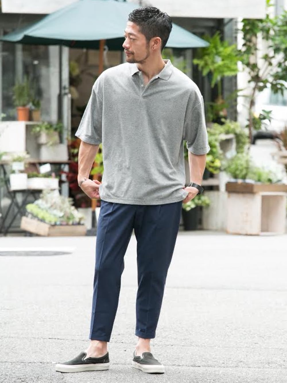 オーバーサイズのポロシャツに細身のスラックスで大人の雰囲気漂うリラックスコーデ。パイル地のポロはキレイ目素材のボトムをチョイスするとグッとまとまります◎