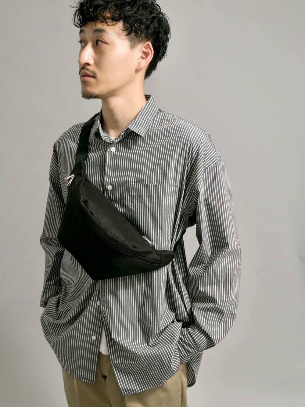今季も好調なリラックススタイルに欠かせないルーズなシャツ。 控えめな大人感のあるストライプ柄をチョイスし、ベーシックなトーンで合わせてシルエット、ニュアンスを楽しめる雰囲気にコーディネートしました。 しかし、なにかひつとつ足りないなーと思いつつ、、 ウエストバッグを肩がけでプラス。 すると、更にまとまりのあるスタイルに!これひとつプラスするだけで今っぽさがグッとでました! デザインもミニマルでアウトドア過ぎないところがコーディネートを邪魔せず逆にいい!上品さを感じます! コンパクトに荷物を纏められますし、休日もこれさえあればフラッとどこでも行けますし、秋のレジャーなんかでも活躍しそうです! ウエストバッグの便利さに感動です! 大容量のサコッシュもございます!