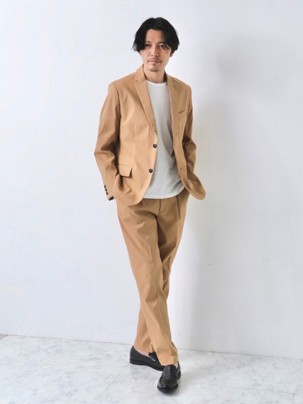 部屋干し3時間、丸洗い可能など機能に富んだ丸井織物の素材が魅力のセットアップ! コットンライクな風合いと美しいベージュの発色が良い分、カットソーに合わせるだけで品良く大人の雰囲気にきまります◎ この春イチオシのアイテムです!