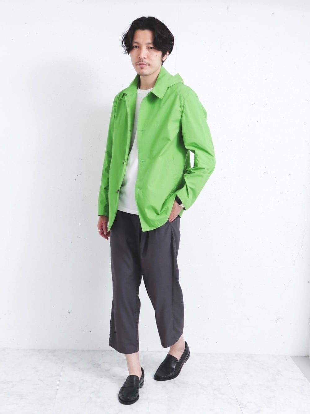 グリーンが目を引くタイプライターコート。とても発色のよい色感です。さっと羽織って主役になれるアイテムです。 パンツはリラックス感のあるイージー仕様のタックワイドパンツ。品の良い光沢感と肌触りもよく穿き心地◎ 綺麗めのコーディネートにも相性良しです。