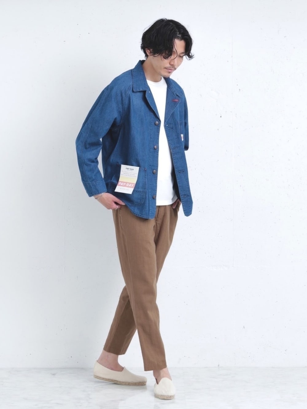 この季節の羽織としても便利なPAYDAYの別注カバーオールにリネンイージーパンツを合わせたスタイリング。休日の大人カジュアルぴったりのコーディネートです♪