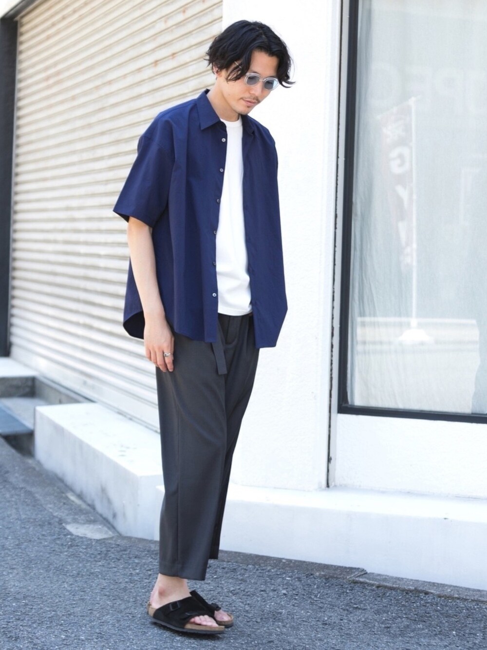 とっても着心地の良い半袖シャツは丸井織物の生地を使用したもの。 ボタンを開けて軽く羽織るだけで雰囲気◎ スラックスにサンダルで休日の大人のリラックススタイルを演出!