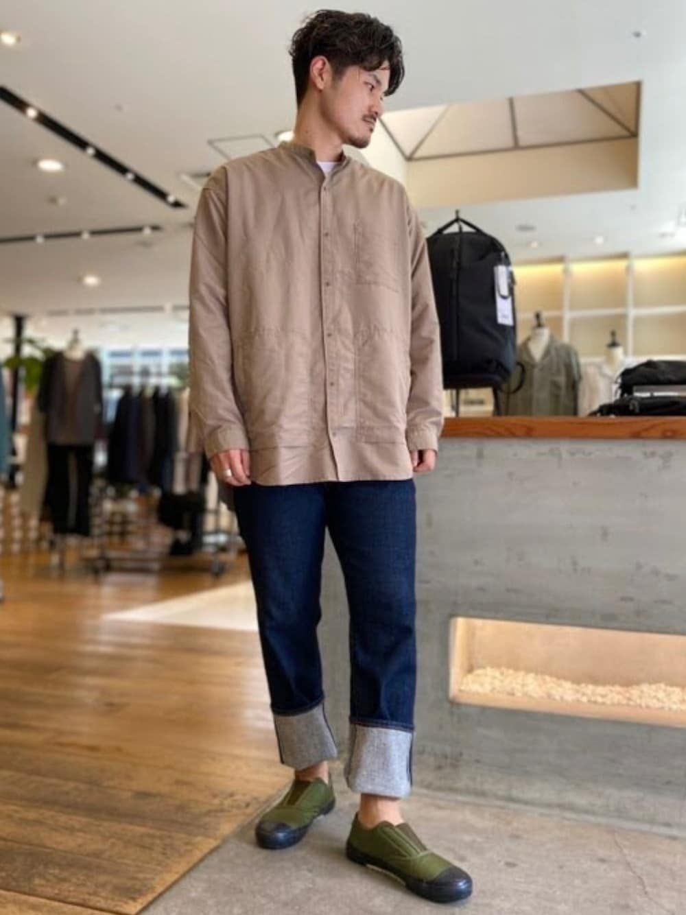 ついにデニムの季節がやってきました! EDWINのこだわりが詰まったセルビッチデニムを深めにロールアップし存在感たっぷりに。 縫い目を見せるのもお洒落ポイントです。