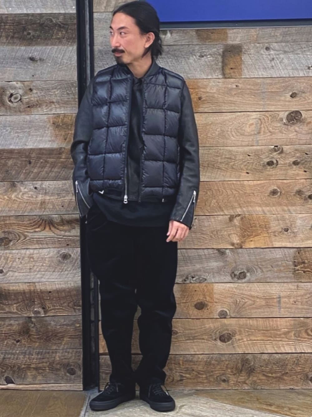 スタッフ人気1番のレザーライダースに、 ダウンベストを合わせた大人が引立つコーディネート。 暖かさとスタイリッシュさを両立し、 周りとも一本差をつけた秀逸スタイリング。