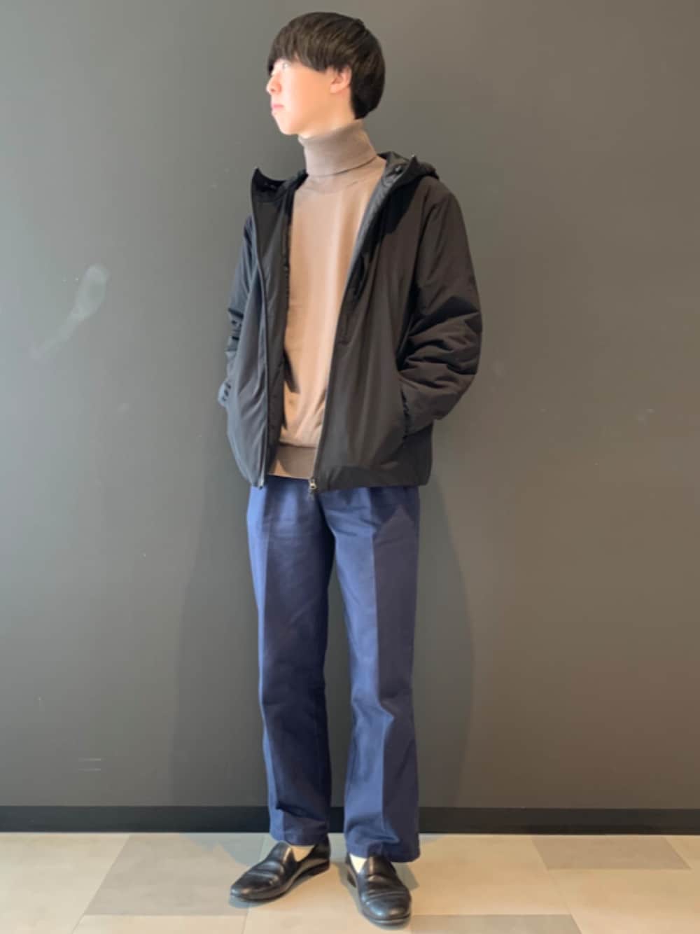 ROSSO MENのナイロンジャケット「ハイクオリティ中綿ライトフードジャケット」を使ったコーディネート