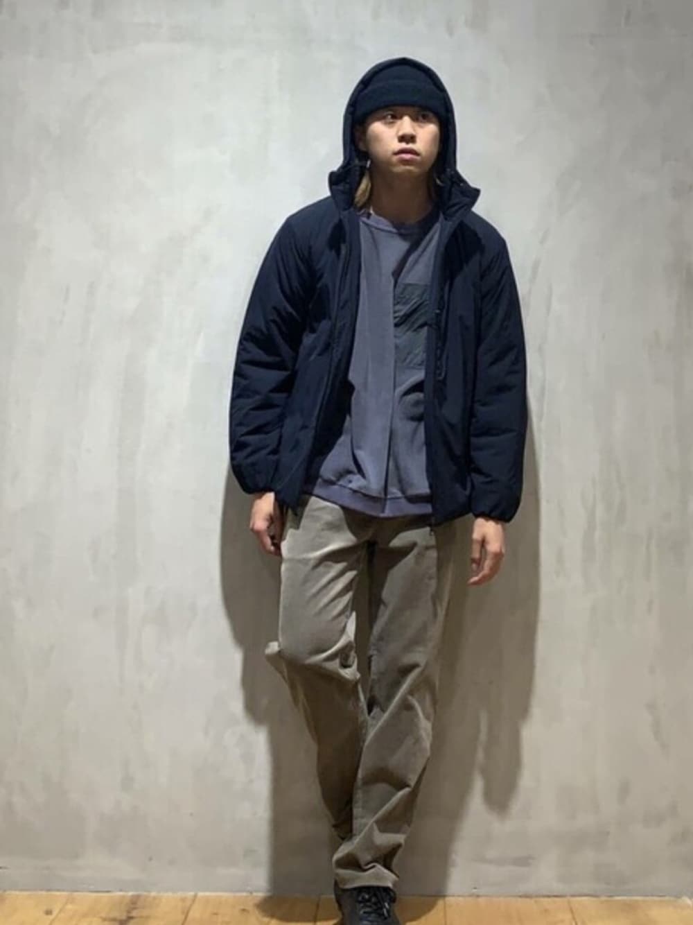 ROSSO MENのナイロンジャケット「ハイクオリティ中綿ライトフードジャケット」を使ったコーディネート