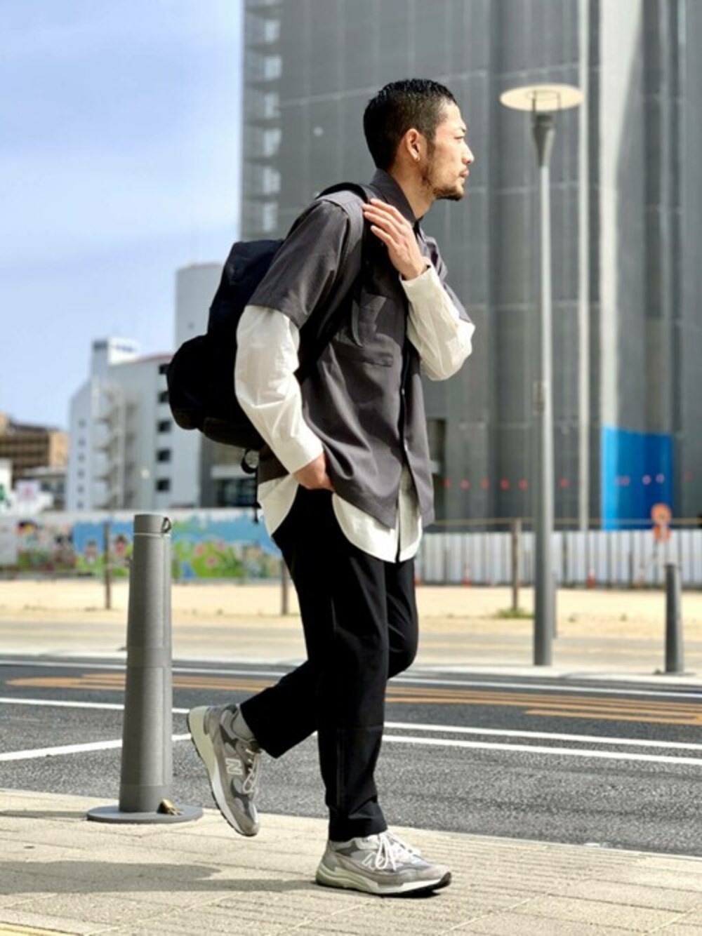 半袖シャツを春先から着れる、定番のロンTとのレイヤードコーデ! モノトーンにまとめることで大人感も引き立ちます♪